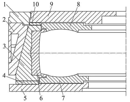 工业轮胎模具导向机构的导向面为圆锥面的称为圆锥面式活络模具,与斜平面相比,圆锥面有良好的可加工性,普通的机床可满足精度要求。圆锥面式模具的装配精度要求较低,模具零件磨损后,周向偏差能够自动补偿,对硫化轮胎圆度影响小,对轮胎的胶边和错花问题影响也不明显。但是模具开合过程中,弓形座和中模套上的耐磨板由线接触逐渐过渡到圆锥面接触,造成耐磨板不均匀磨损、模具动作不平稳以及对硫化机的适应性低。